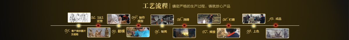 制作一件完美的鑄銅雕塑,最重要的步驟就是制作泥塑模型,然后再用工業(yè)硅膠拓印、翻模。所以泥塑的姿態(tài)、神情生動與否直接影響最終銅雕塑的品質(zhì)。所以我廠一直對泥塑模型的制作格外重視。我廠以雕塑為本,以藝術為根,挾中華文化之傳統(tǒng),偕歐陸藝術之風韻,風格獨特,盡顯淋漓盡致。我們本著大膽創(chuàng)新、勇于突破的精神,以追求卓越為導向,堅持寧缺勿濫為原則,并可依照您提供的要求,為您量身設計制作。我廠人才濟濟,有智慧嚴謹?shù)墓芾戆嘧樱姸嗄贻p充滿激情、充滿創(chuàng)意的專業(yè)設計團隊、有專業(yè)技術精湛的雕塑制作人才和專業(yè)的施工隊伍。他們不僅具深厚的文化藝術底蘊,更汲取當代雕塑精華,博采眾家之長,作品既有嚴肅莊重寫實題材,也有輕松前衛(wèi)的抽象題材,表現(xiàn)手法上浪漫主義中不乏樸實,現(xiàn)實主義中蘊涵著激情,設計理念貫穿古今、融匯中西,深刻詮釋著藝術的精髓,把古典主義和后現(xiàn)代主義完美的融合,將雕塑藝術演繹為力的凝聚、美的體現(xiàn),讓人們感受到的不僅是一種藝術的浪漫與優(yōu)雅、粗獷與悲壯、更是豐富的優(yōu)秀藝術寶藏和文化傳統(tǒng),讓您在藝術與文化中穿流,在時空中飄蕩,使靈魂在藝術的海洋洗禮。 MORE+